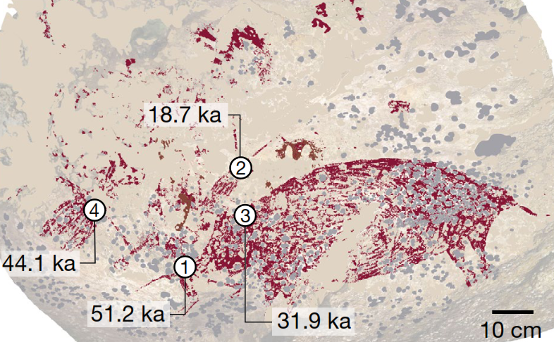 Terdapat empat titik pengambilan sampel untuk menentukan usia lukisan. Sampel pada lukisan manusia yang kemudian memberikan angka minimal 51.500 tahun yang lalu. Sedangkan bagian yang lain menunjukkan usia yang lebih muda. Selain itu, dalam artikel tersebut dilakukan penanggalan ulang di Leang Bulu Sipong 4 yang meghasilkan usia 48.000 tahun yang lalu. Lebih tua 4.000 tahun dibandingkan peninggalan sebelumnya.